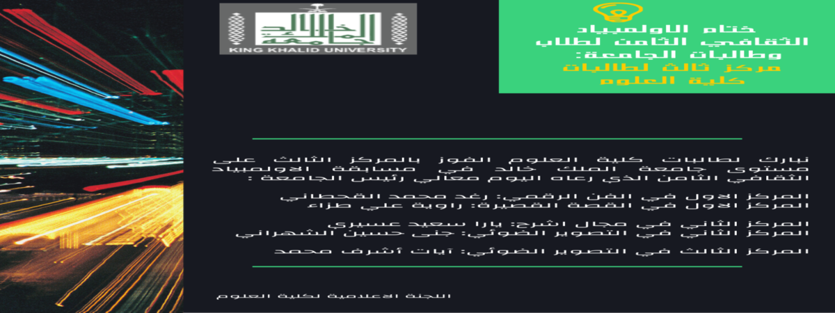 نبارك لطالبات كلية العلوم الفوز بالمركز الثالث على مستوى جامعة الملك خالد في مسابقة الاولمبياد الثقافي الثامن الذي رعاه اليوم معالي رئيس الجامعة…